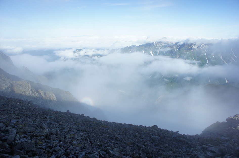 저 뒤로 우리가 첫날 올랐던 야리가다케(槍ヶ岳)가 잠시 구름사이로 얼굴을 내밀다 이내 사라져 버린다.