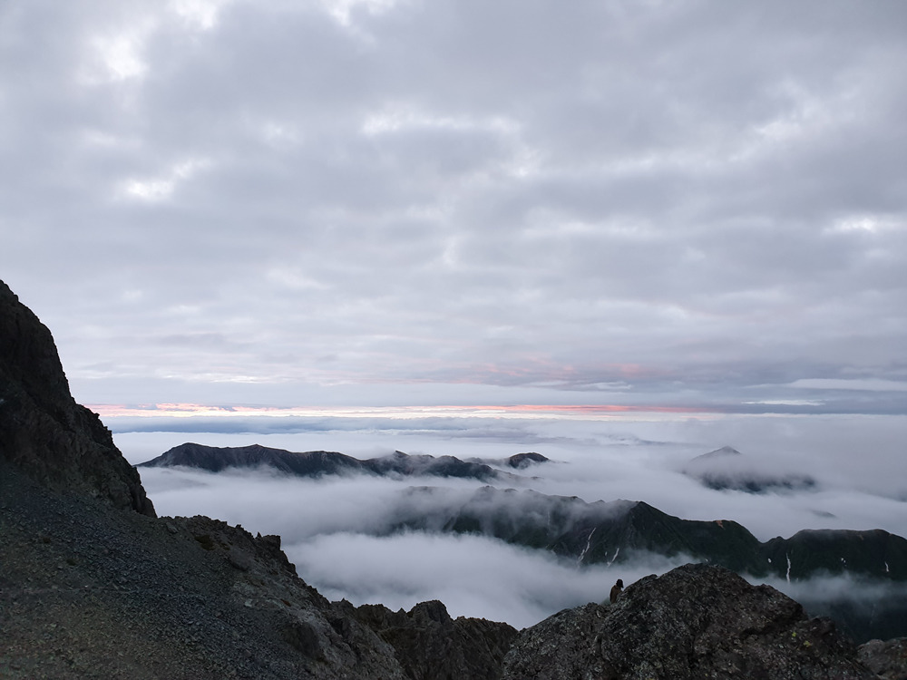 산장에서 본 일출 너머로 중앙알프스의 산군들도 어렴풋이 보인다.