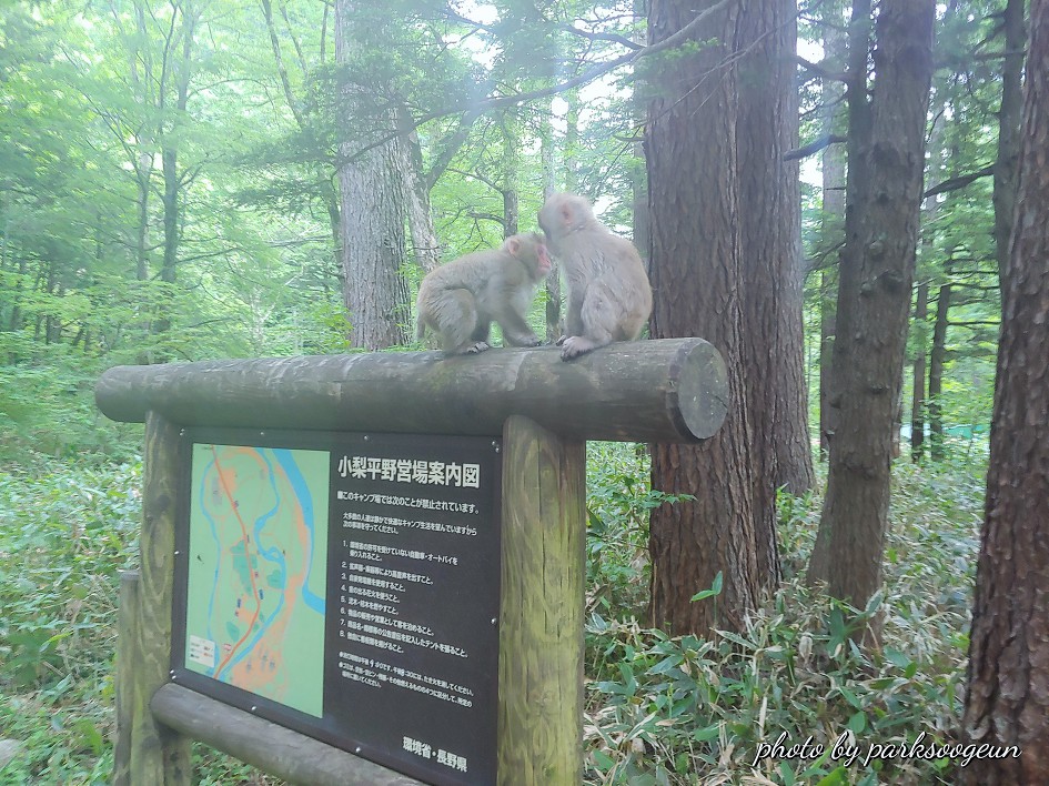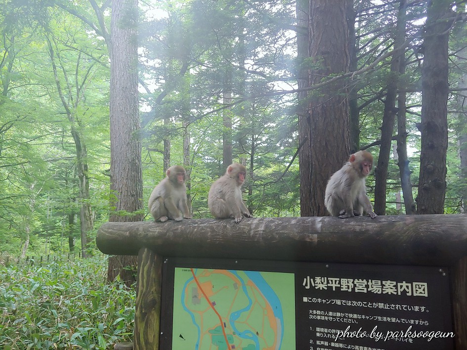 산장 주변에서 놀고 있는 일본원숭이(대체로 체구가 작음)