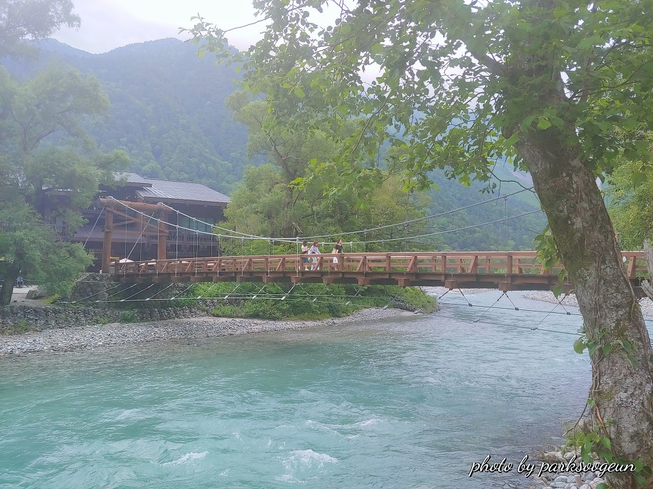 갓빠바시(河童橋)와 그아래 아즈사가와(梓川)강으로 만년설이 녹아서 흐르는 옥색의 물빛이 너무 곱다.