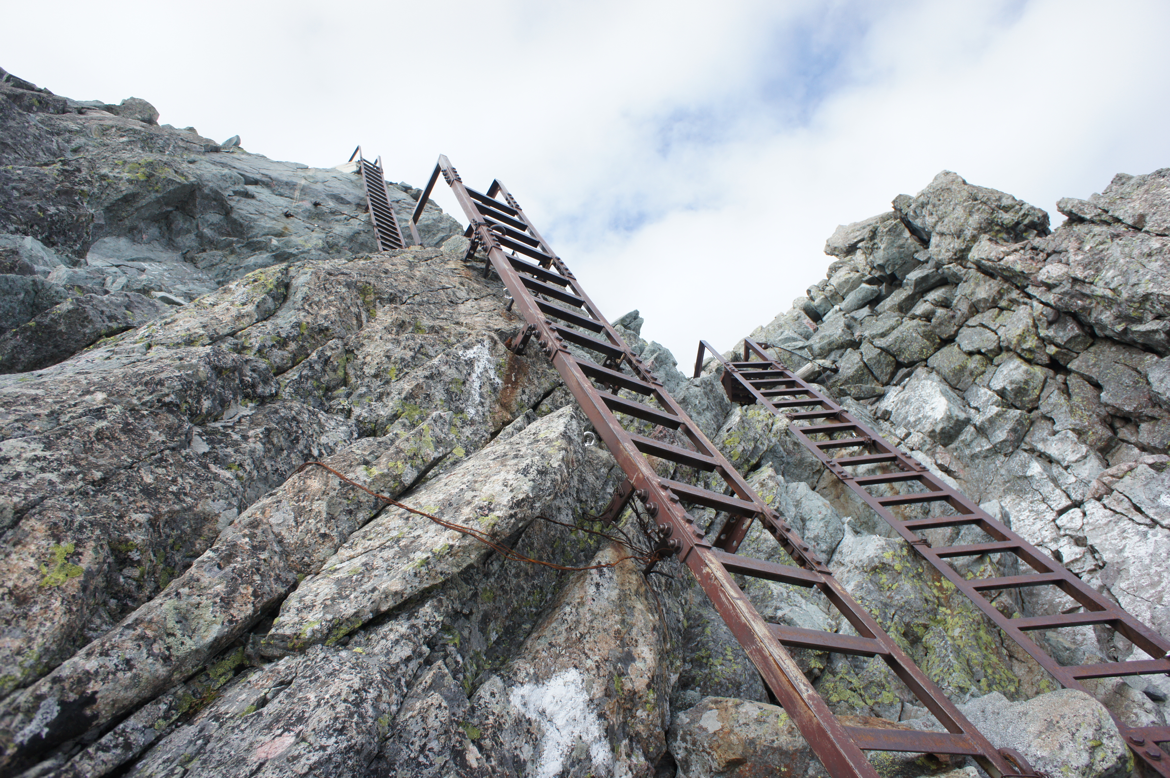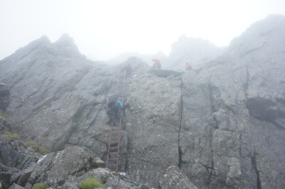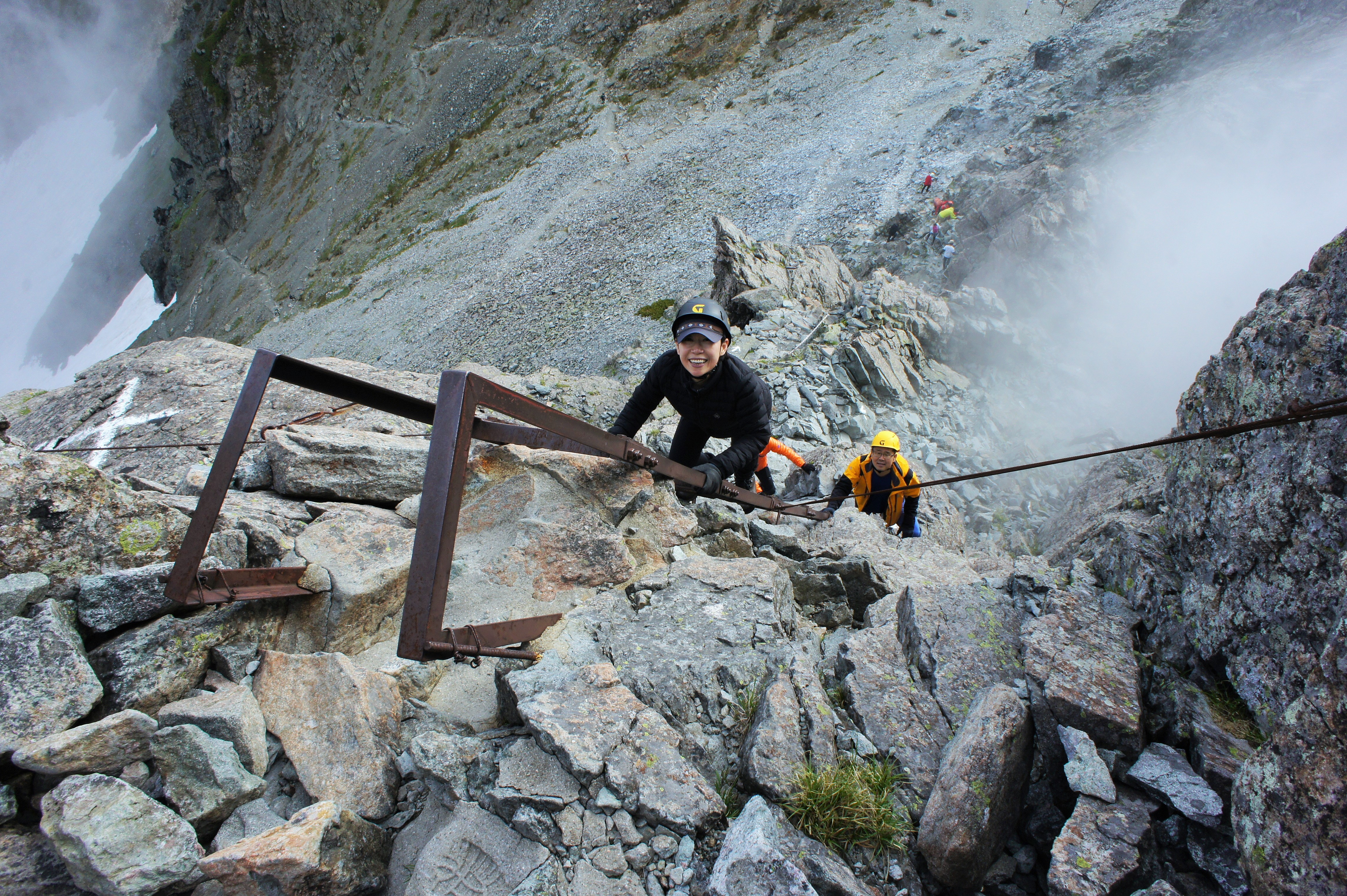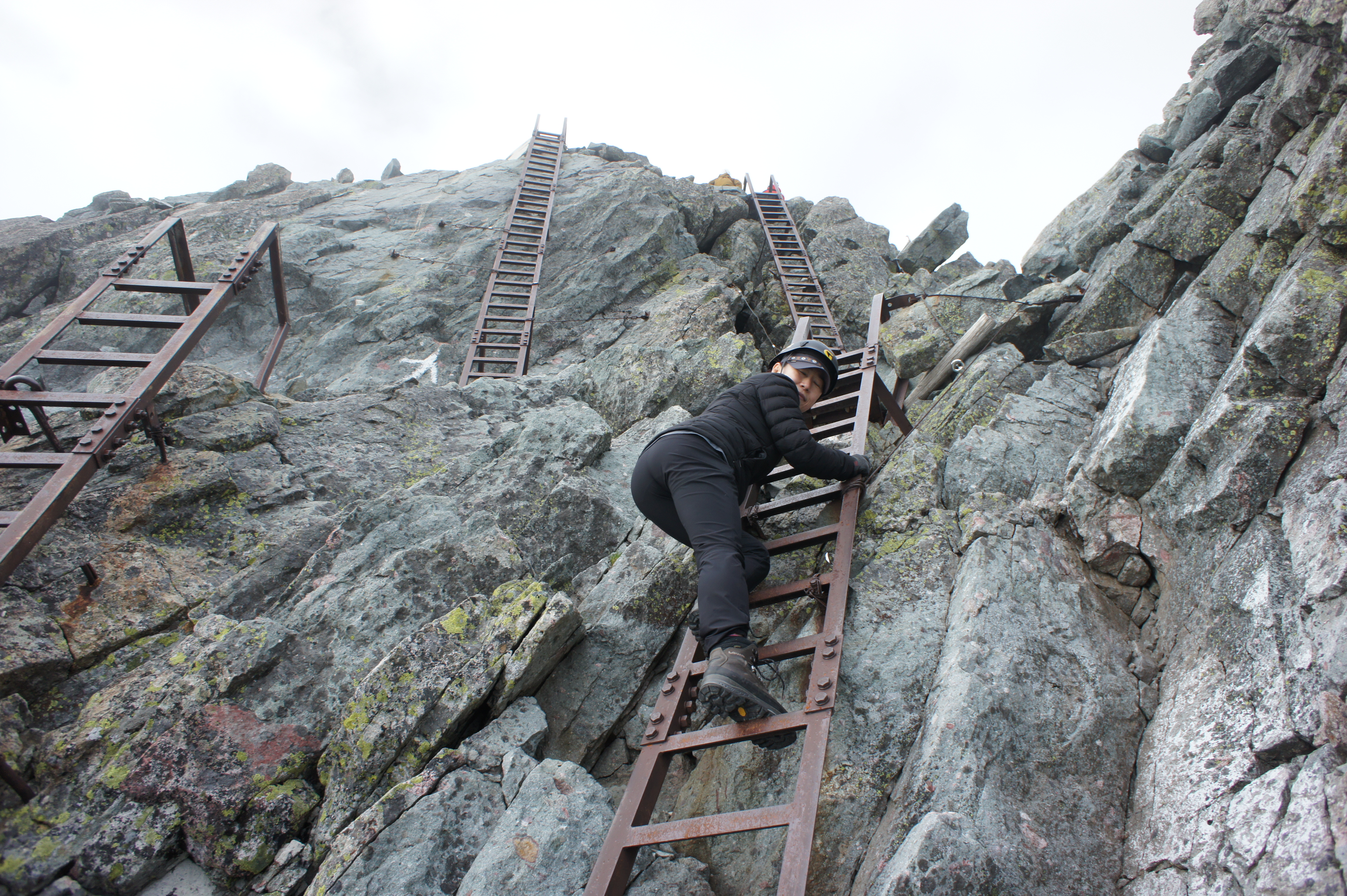 산장을 출발하여 槍ヶ岳(Yarigatake)로 오르는 길은 철사다리와 쇠사슬의 연속이다.