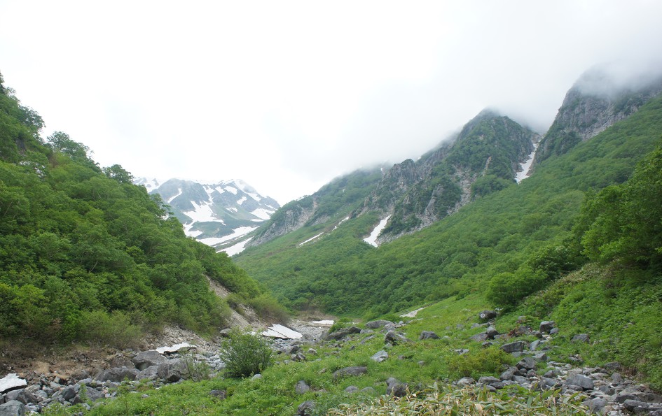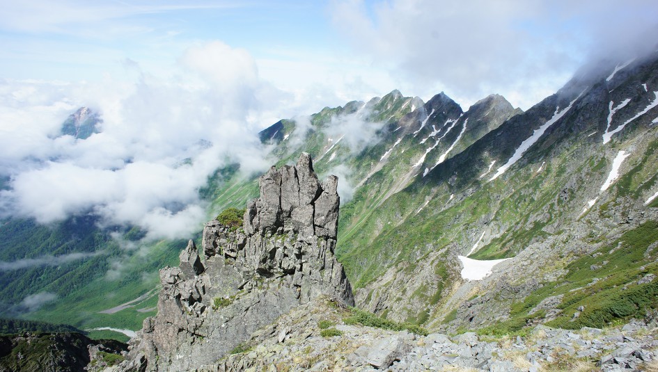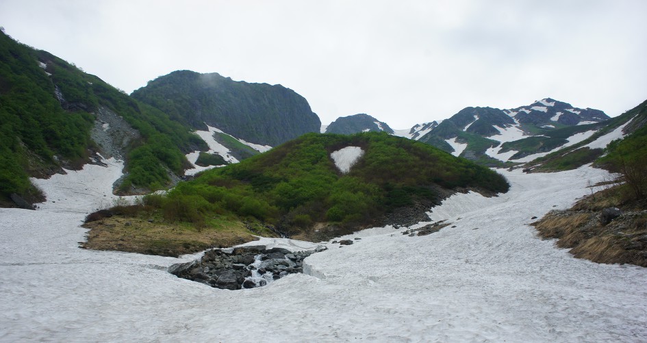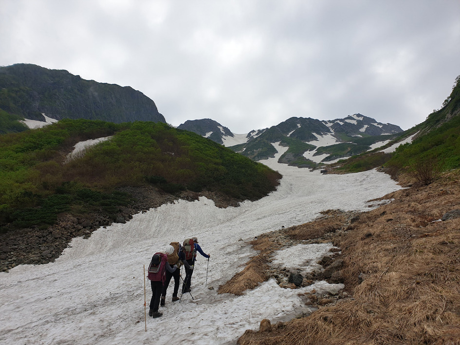 계속 고도를 높이며 나아가자 오오바미다케 방향의 만년설과 아름다운 설산이 탄성을 자아내게 한다.