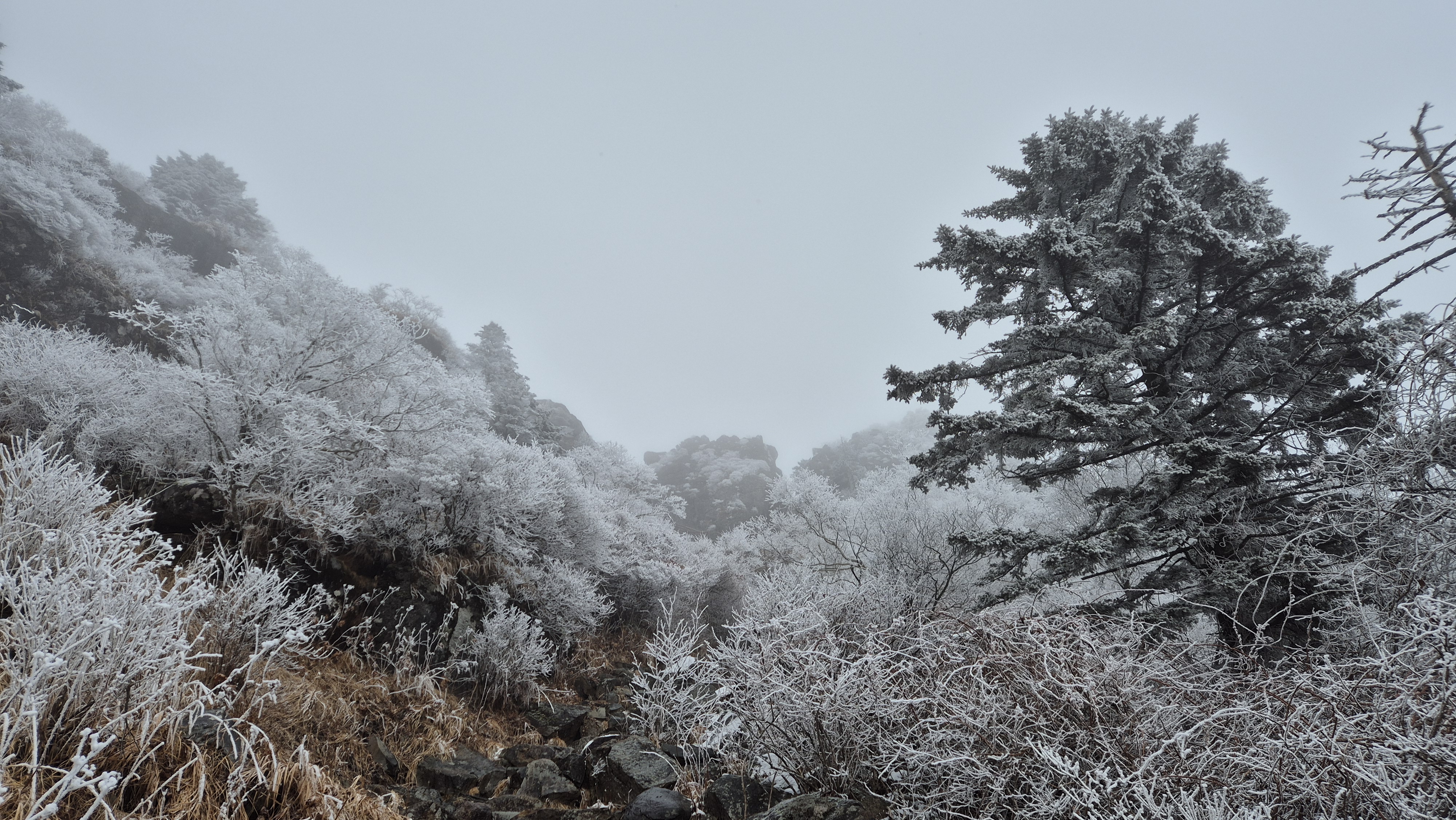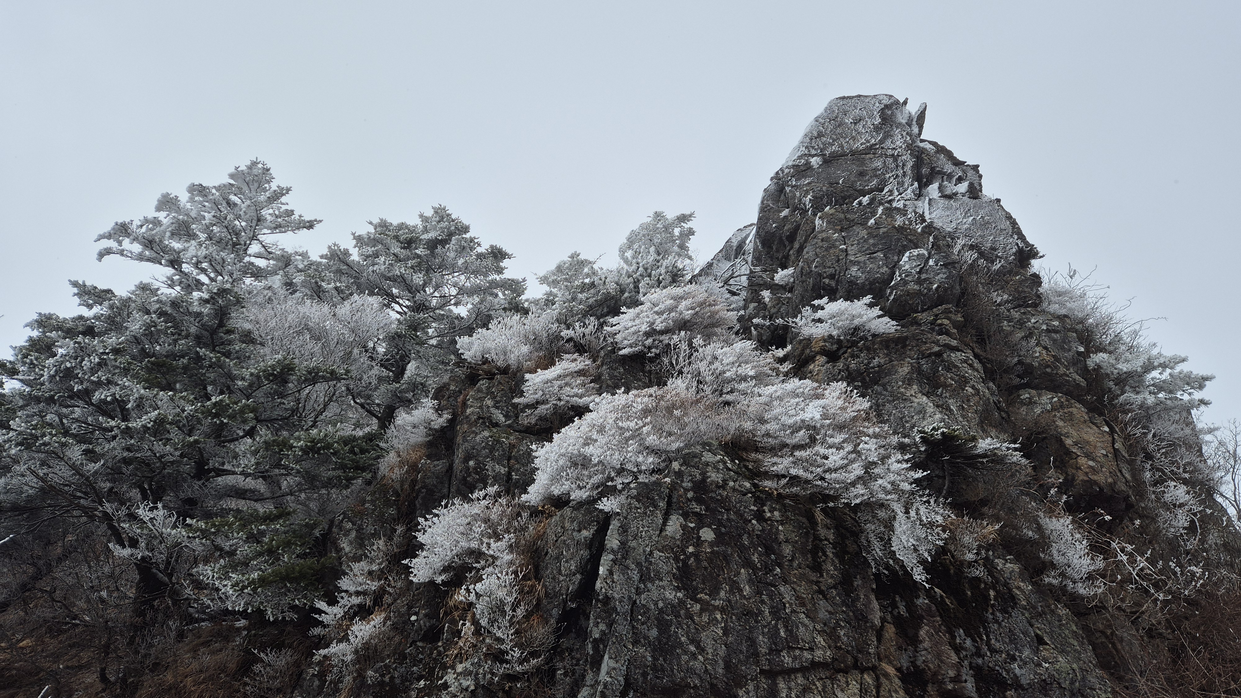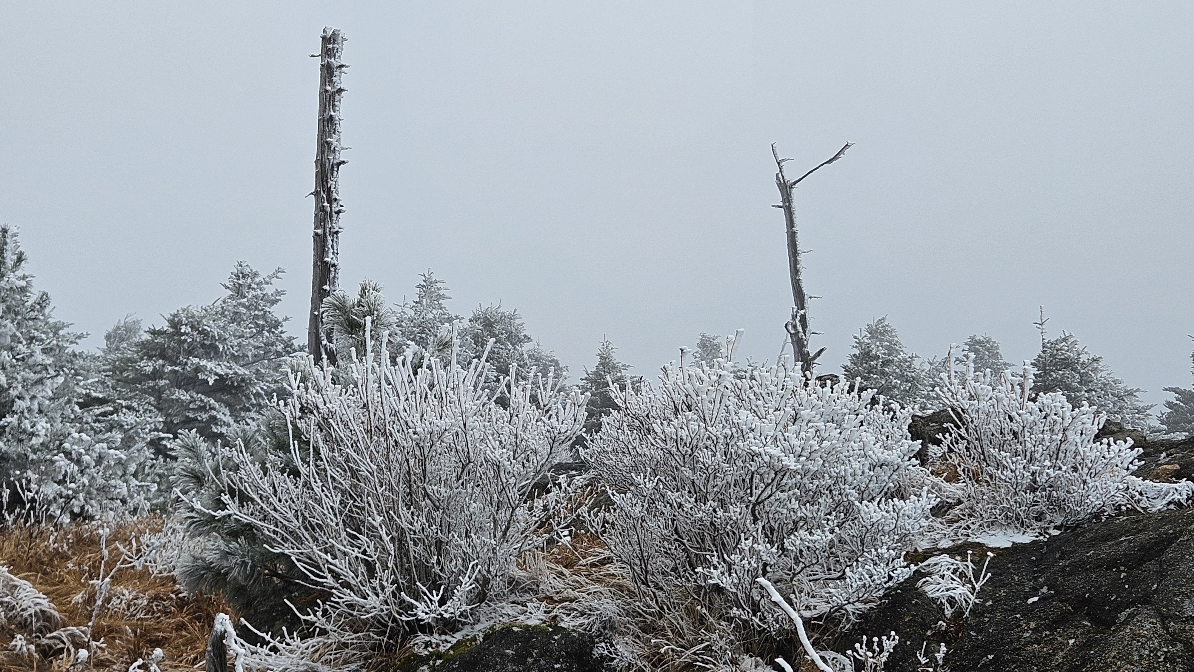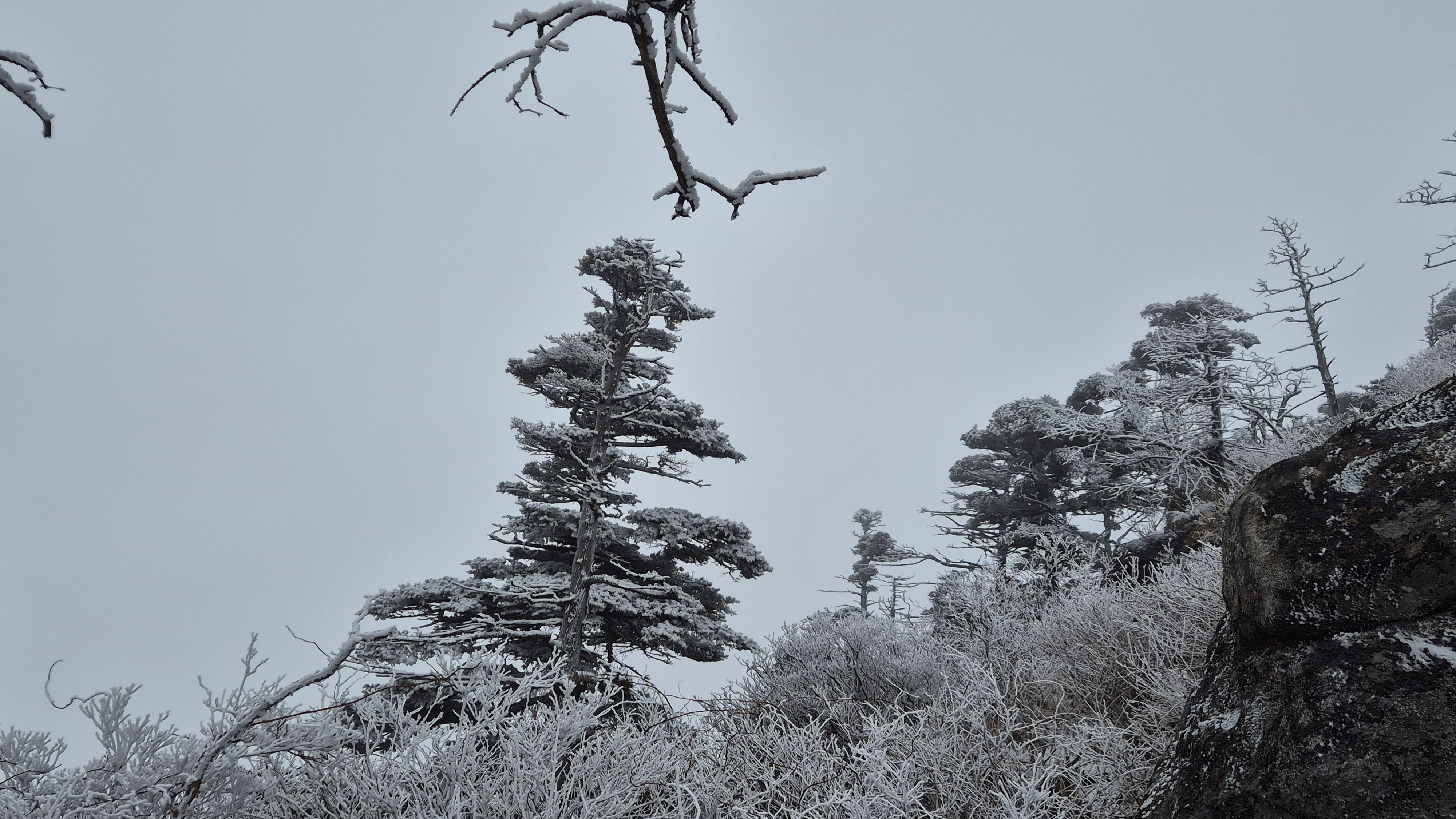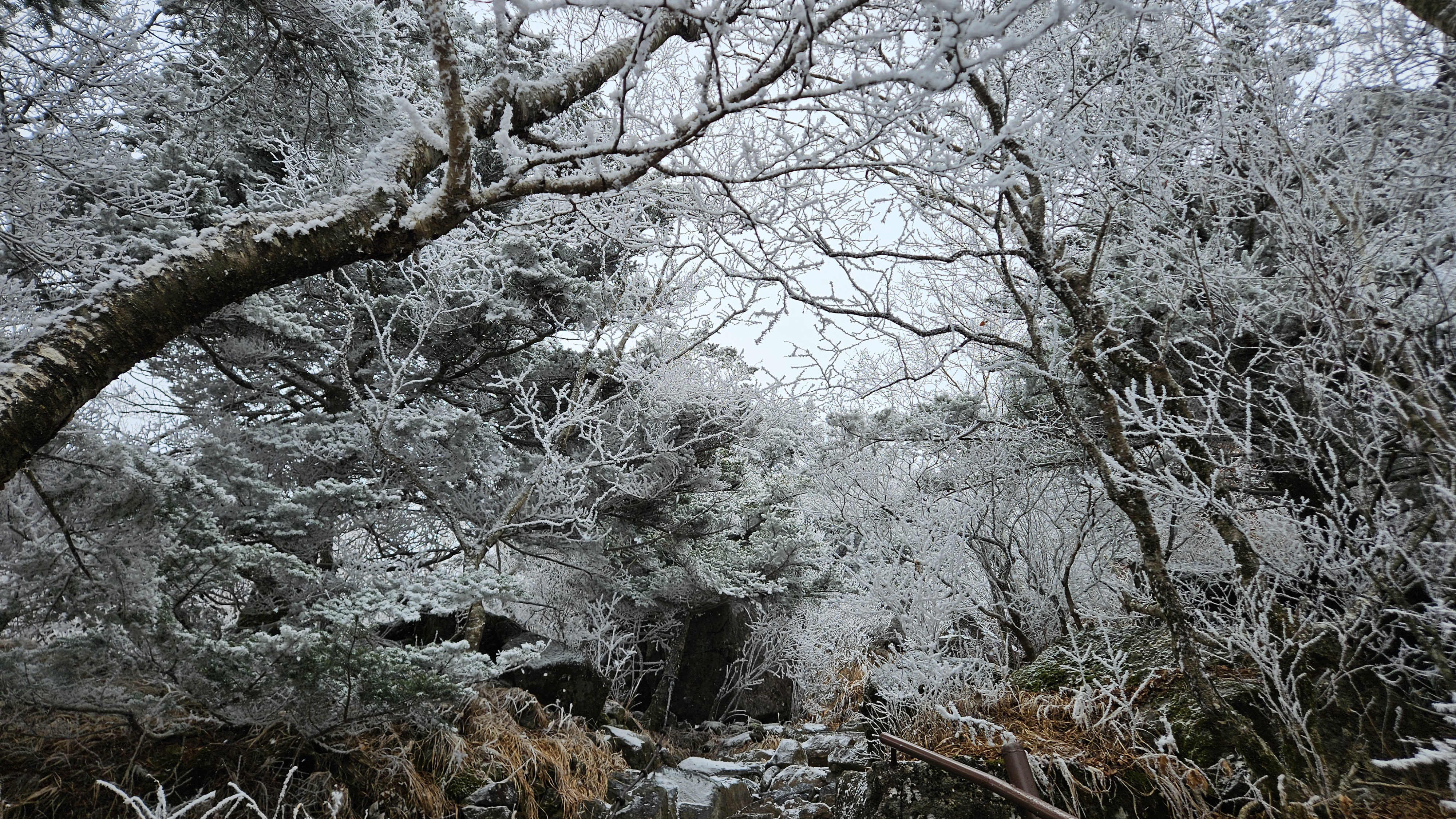 고도를 높이니 길바닥은 얼음으로 많이 미끄럽고 주변은 온통 상고대가 아름답게 반겨줍니다.
