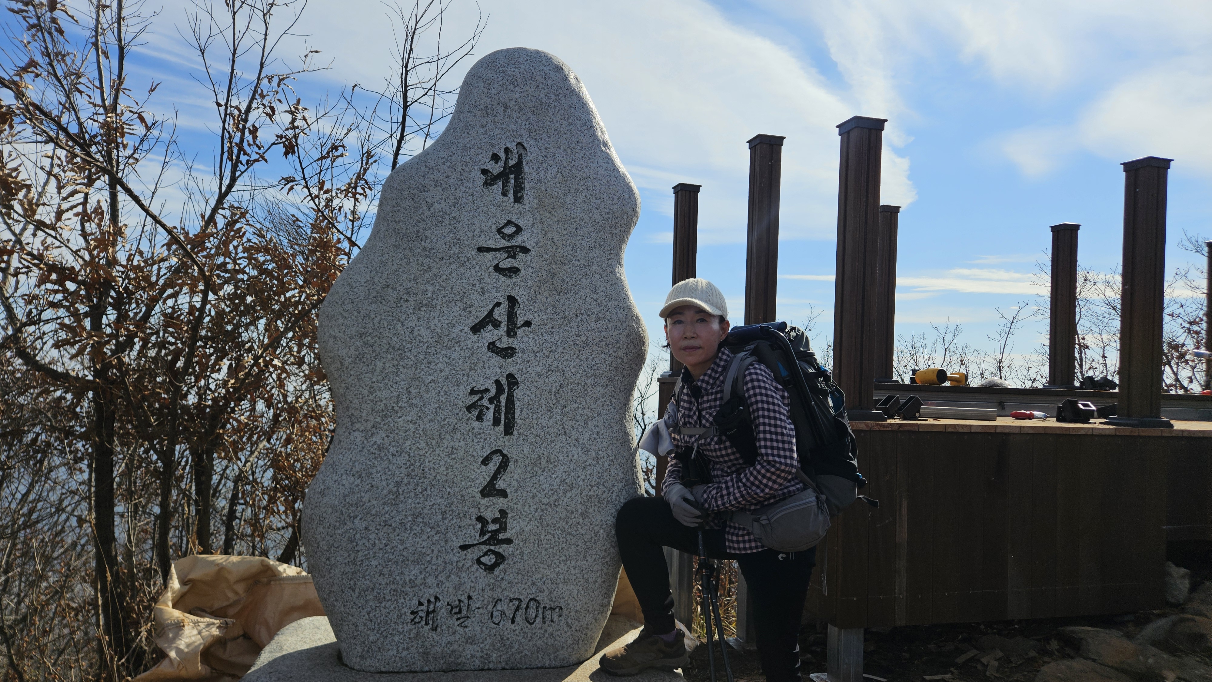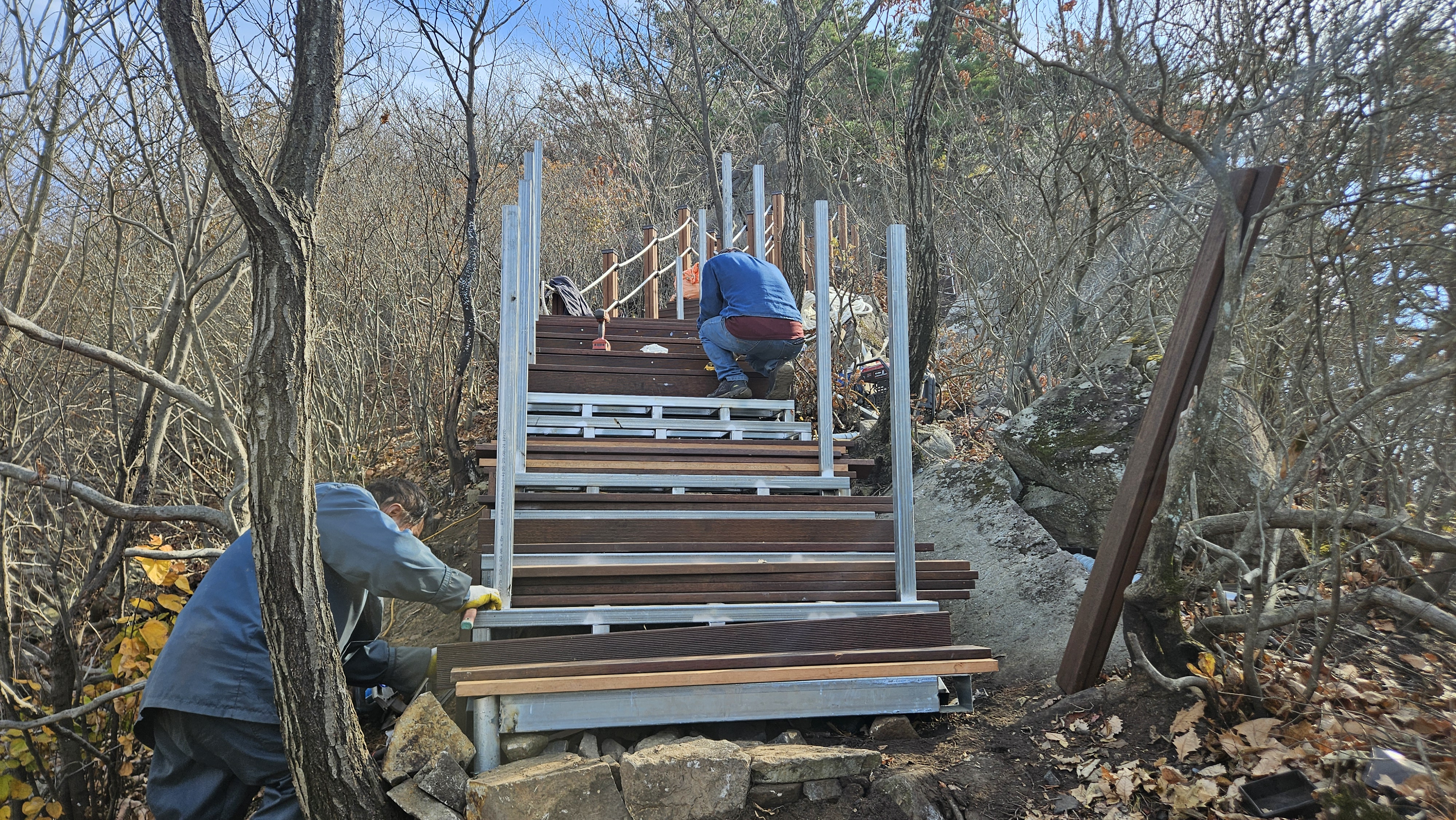 2봉 정상에 도착해 보니 정상의 나무데크와 주봉 방향의 계단들도 완전 전소되어 다시 만드는 공사가 한창 진행 중에 있습니다.