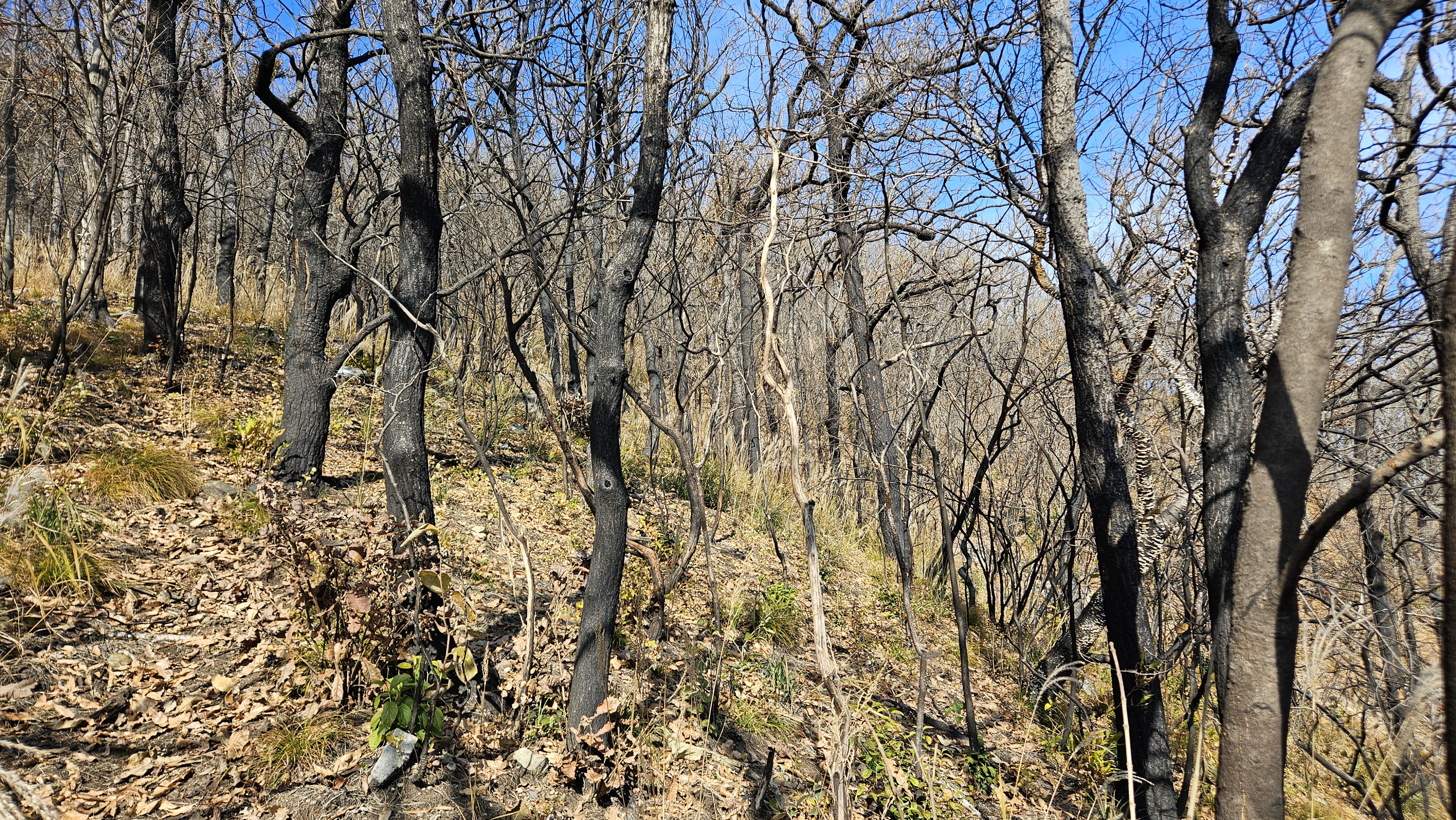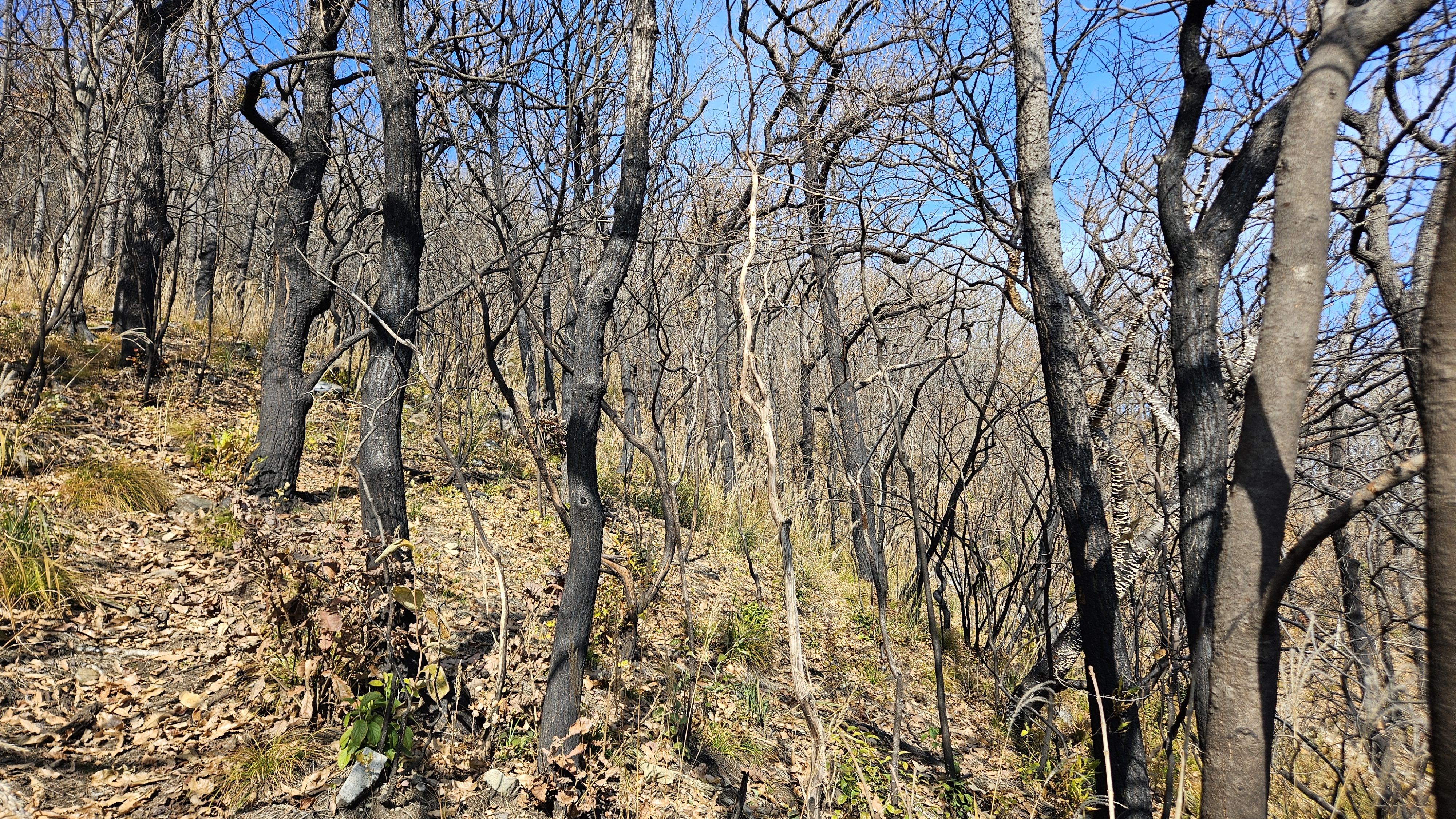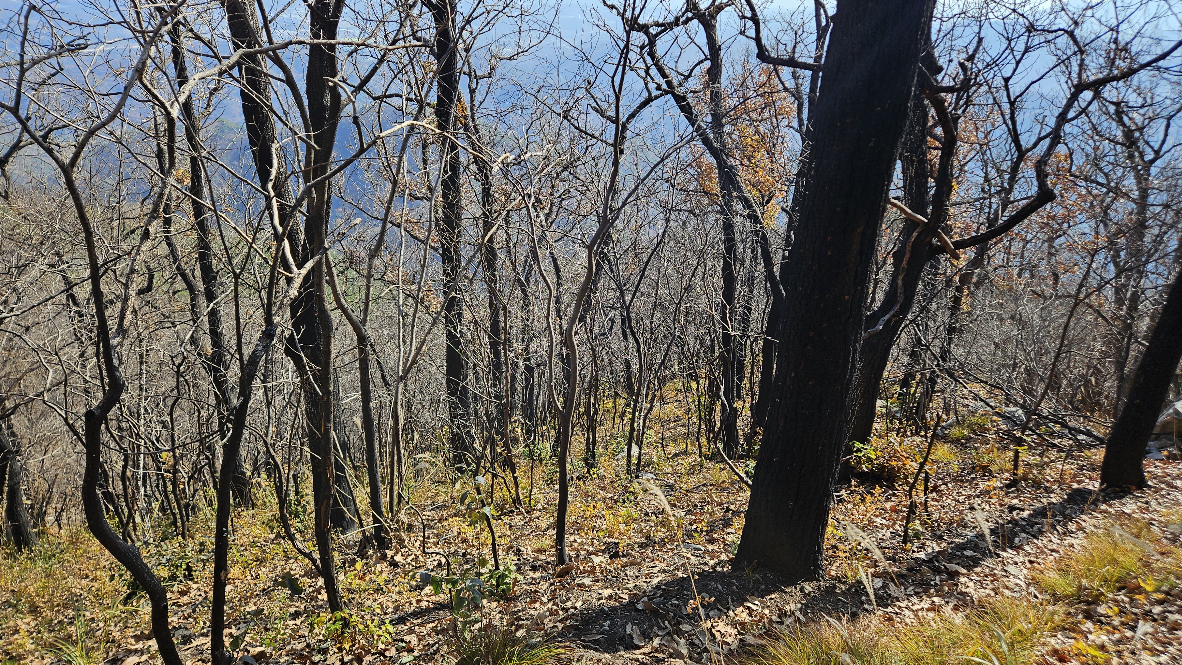 2봉 정상까지 모든 나무들이 새까맣게 숯덩이 변해서 안타깝기 그지없습니다.