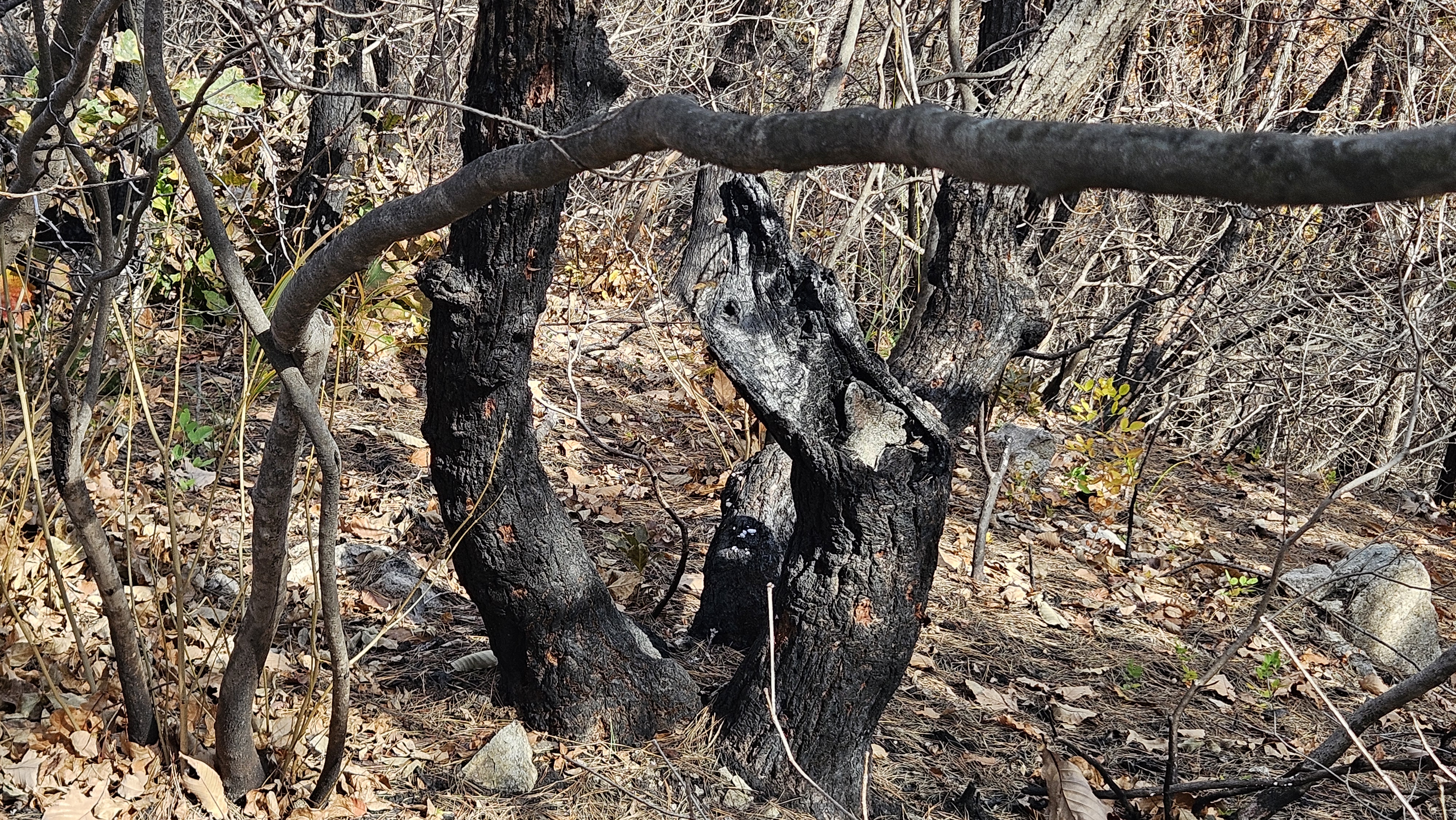 돌로 만들어진 무덤 2기를 지나고 2봉 구간의 중봉에 해당되는 된비알을 치고 오르니 등로옆의 나무들이 숯덩이로 변해 있네요