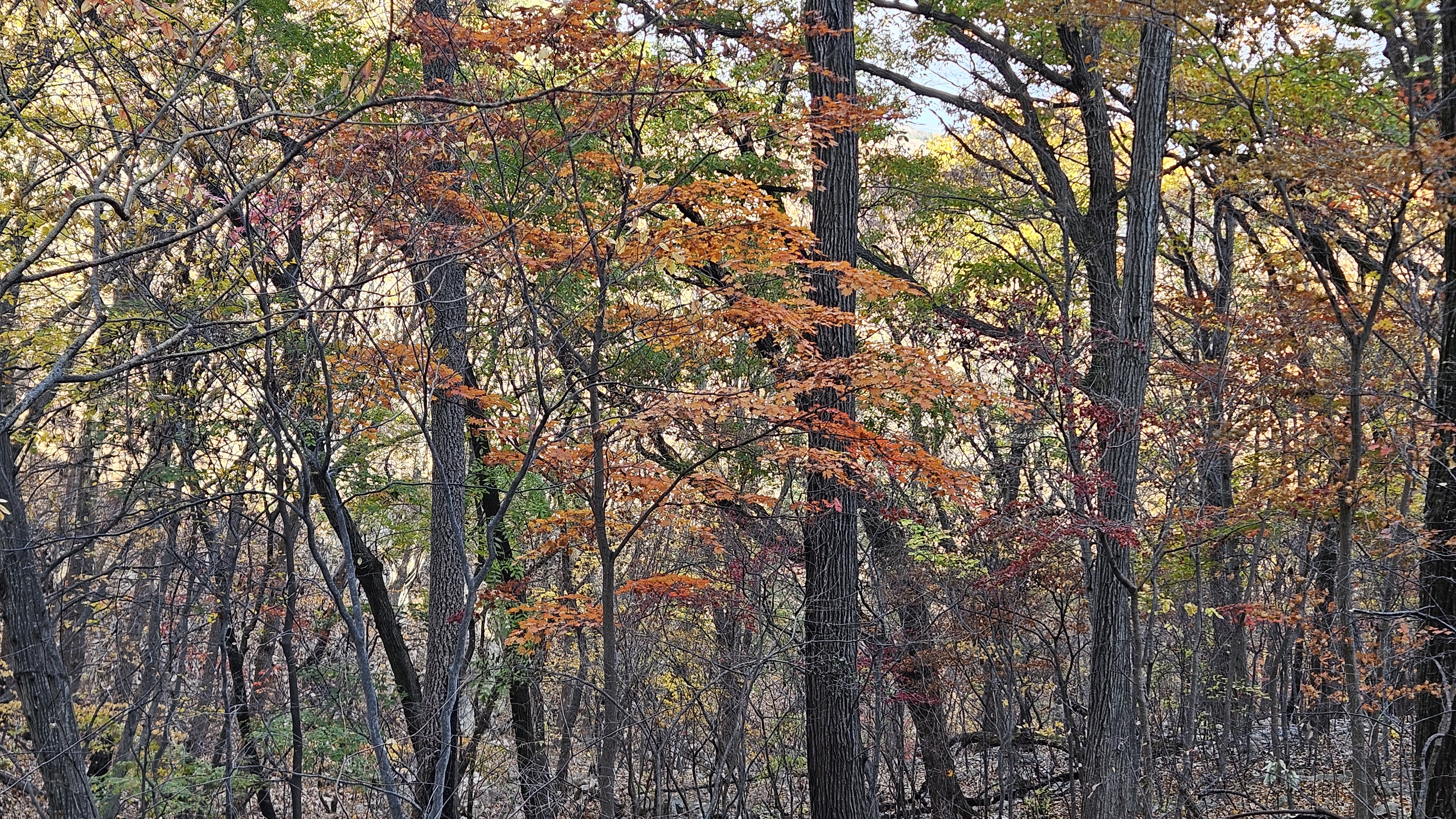 오름길에 내원암 계곡 쪽을 바라보니 협곡옆 깎아지른 암벽에도 가을은 남아 있습니다.