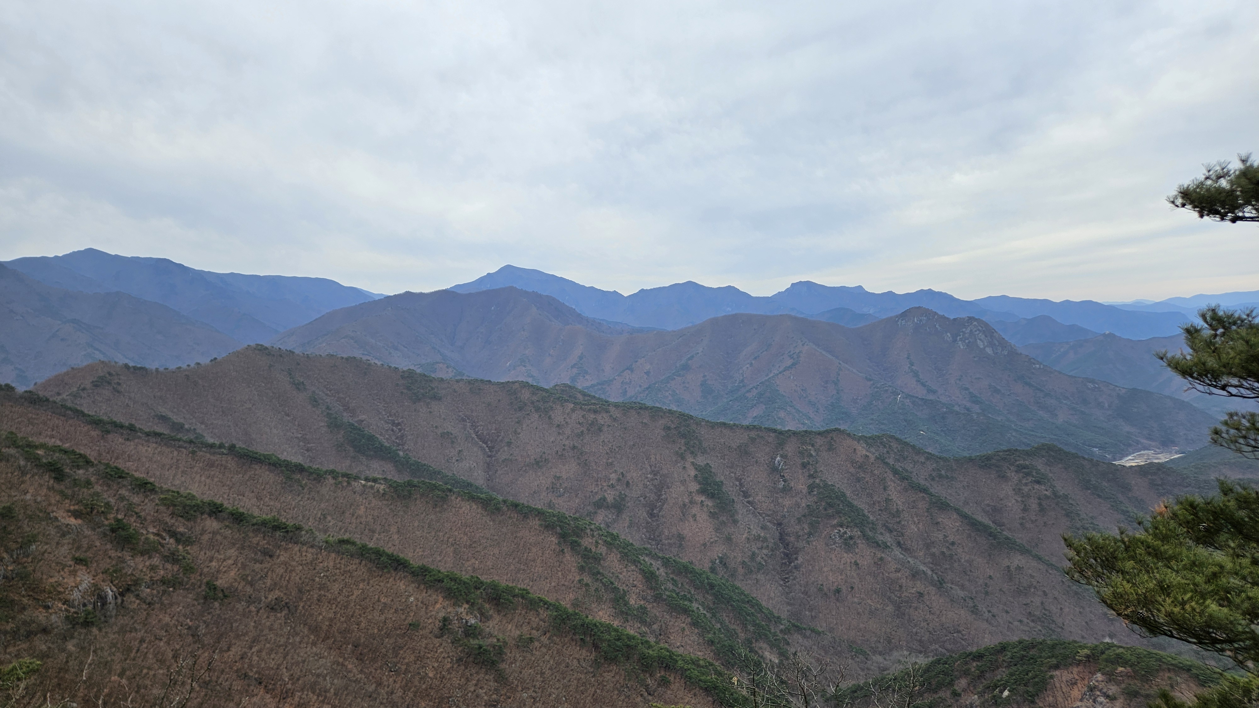 잠시 가파르게 치고 올랐던 좌측 산허리와 방금 지나온 능선을 돌아봅니다.